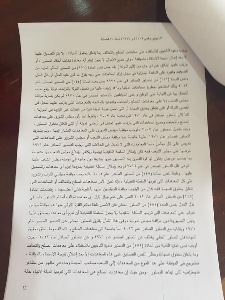 كما شددت على أن المادة 151 من الدستور تتضمن حظرًا شاملاً لتوقيع أي معاهدة تخالف أحكام الدستور أو يترتب عليها التنازل عن أي جزء من إقليم الدولة، ويمتد هذا الحظر إلى السلطة التنفيذية.