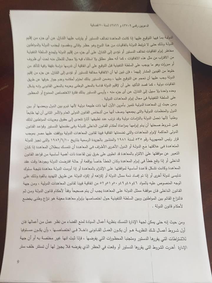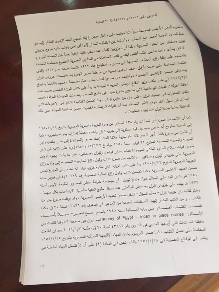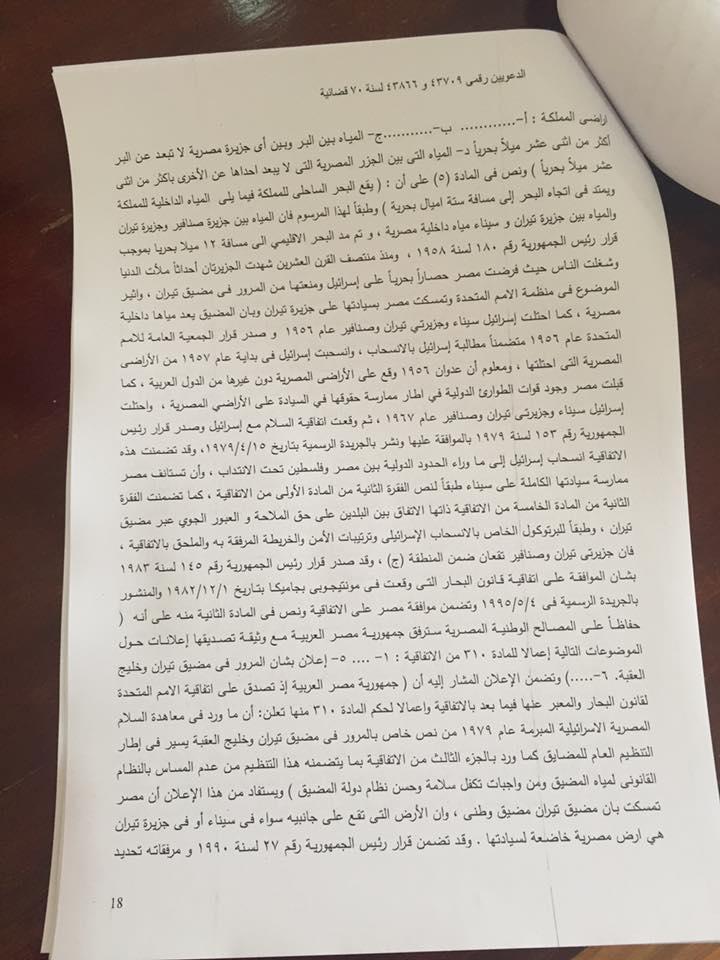 وذكرت أن الدعوى تتعلق بصحيح تطبيق نص المادة 151 من الدستور ومدى مشروعية التوقيع على اتفاقية ترسيم الحدود بما ترتب عليها من التنازل عن الجزيرتين المذكورتين، وذلك في ضوء النصوص القانونية واللائحية والاتفاقيات التي تحكم وضعهما والظروف التاريخية والواقعية المحيطة بهما.