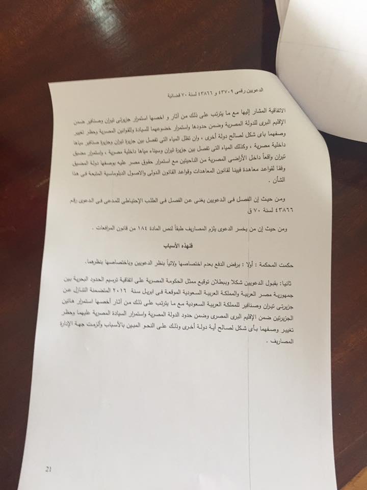 رفضت محكمة القضاء الإداري في حيثيات حكمها اتفاقية ترسيم الحدود ، وذلك في الدعوى المقامه من المحامي خالد على والخصوم المتدخلون ضمنيا وهم 182 مختصم  إلى المدعي من بينهم مالك عادلي وأسماء علي وأحمد سعد دومه ومنى مينا وحسام مؤنس وأخرين .