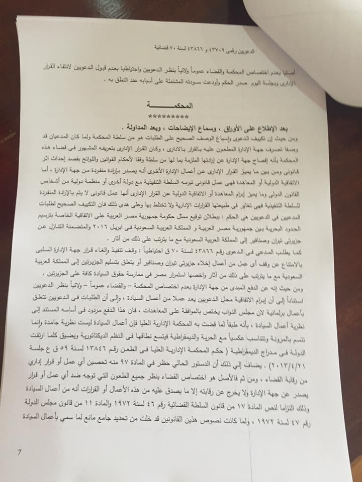 وانتهت المحكمة بأنه “نزولاً على ما تقدم، فإنه من المقطوع به الآن أن كلا الجزيرتين أرض مصرية من ضمن الإقليم البري لمصر، وتقعان ضمن حدود الدولة المصرية، وقد مارست مصر السيادة على الجزيرتين بصفة دائمة ومستمرة، وتخضع الجزيرتان للقوانين واللوائح المصرية، وأن ترسيم الحدود البحرية مع أي دولة لا يتصل إقليمها البري بالإقليم البري المصري لا يجوز أن يمتد أثره إلى جزء من الإقليم البري المصري الذي يشمل جزيرتي تيران وصنافير“.