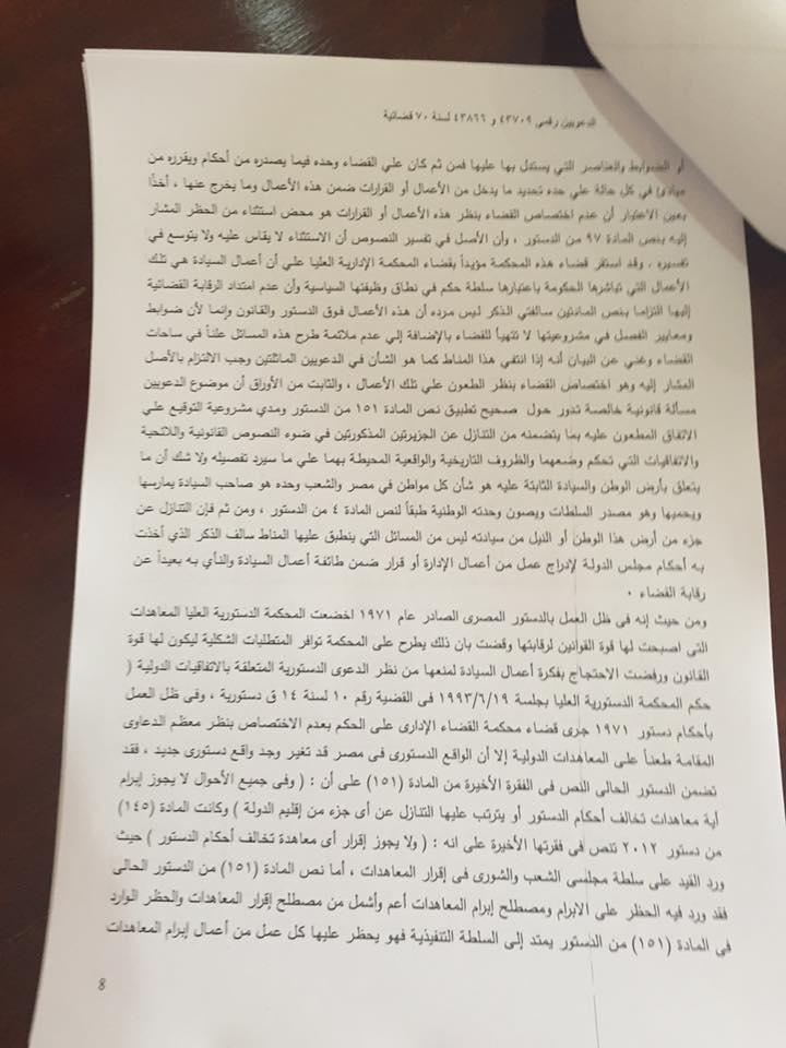 بالصور.. حيثيات حكم القضاء الإداري بأحقية مصر في “تيران وصنافير”