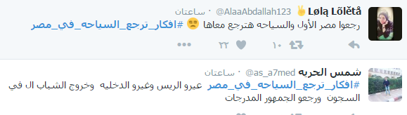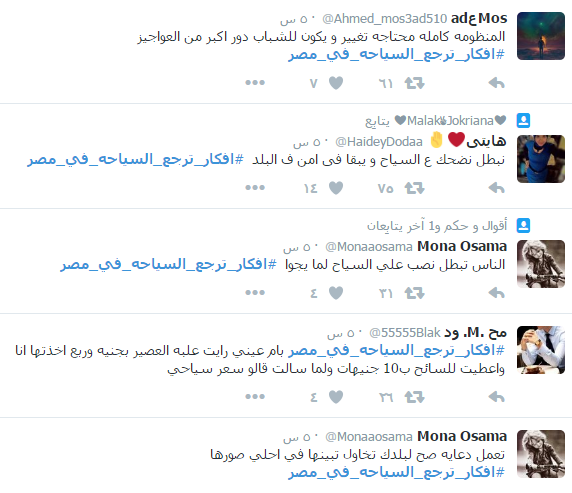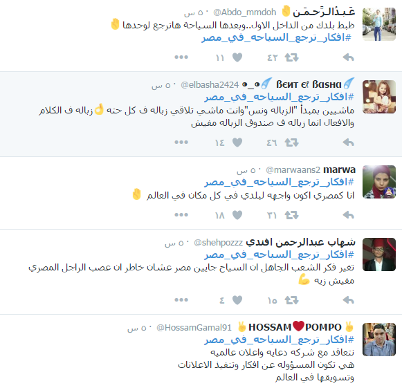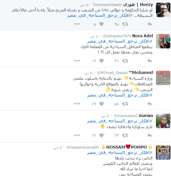 وطرح فريق من المغردين أفكار لدعم وتنشيط السياحة، منها الترويج للمناطق السياحية المصرية عبر المواقع الأجنبيه، والتعاقد مع شركه دعايا وإعلان عالمية للتسويق للأماكن السياحية المصرية.