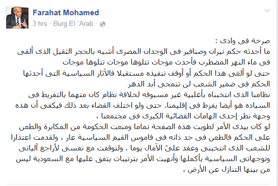 وقال فرحات “ما أحدثه حكم تيران وصنافير في الوجدان المصري، أشبه بالحجر الثقيل الذي ألقى في ماء النهر المضطرب، فأحدث موجات تتلوها موجات تتلوها موجات، حتى لو ألغى هذا الحكم أو أوقف تنفيذه مستقبلاً، فالآثار السياسية التى أحدثها الحكم فى ضمير الشعب لن تنمحى أبد الدهر”.