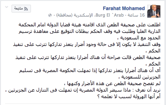 قال ، الفقيه الدستوري محمد نور فرحات، "اطلعت على صحيفة الطعن الذى اقامته هيئة قضايا الدولة امام المحكمة الدارية العليا وطلبت فيه وقف الحكم ببطلان التوقيع على معاهدة ترسيم الحدود مع السعودية".