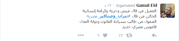 – الحقوقي جمال عيد: “العميل من قال عيش وحرية وكرامة إنسانية ، الخائن من قال تيران و صنافير مصرية ، الممول من طالب بسيادة القانون ودولة العدل … ، قاموس مصري جديد”.