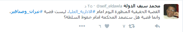 – محمد سيف الدولة :” القضية الحقيقية ليست قضية تيران وصنافير ، وإنما قضية هل ستصمد المحكمة أمام ضغوط السلطة ؟
