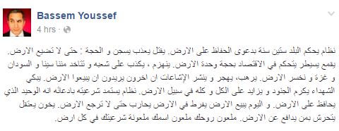 باسم يوسف: النظام المدعي الحفاظ على الأرض يحارب حتى لا ترجع
