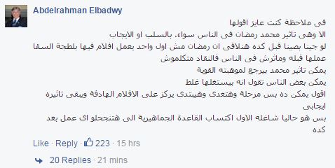 وانتقد عدد من جماهير الفنان فرحته بانتشار صورة الشخصية على تيشيرتات العيد، وعقبوا على المنشور متهمينه بأنه يضر المجتمع، ويصنع العديد من البلطجية والخارجين عن القانون.