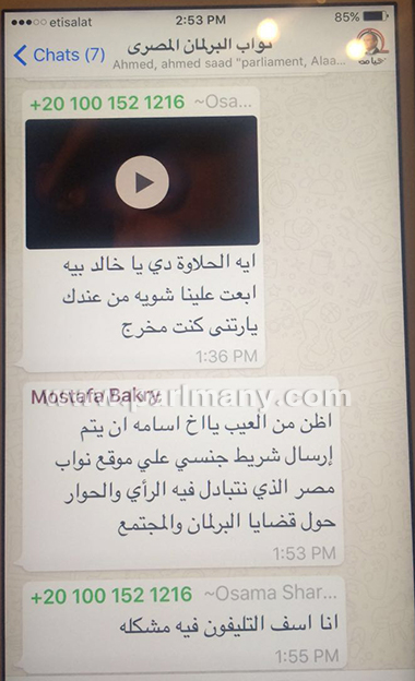 وفى سياق متصل، قال النائب علي عبد الونيس بلغة حادة: “والله عيب، المفروض إنكم رموز، والناس تثق فيكم، وهذا التصرف الصبياني، لا يليق بنواب الشعب، وفى الشهر الكريم، ويجب محاسبته على هذا الخطأ”، ما دفع “بكري” لتكرار رسالته للنائب أسامة شرشر: “أرجو منك أن تسحب الشريط الجنسي فورًا من على الموقع يا أخ أسامة”.
