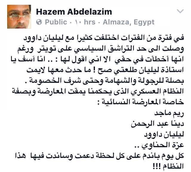 وأضاف عبدالعظيم خلال منشور له عبر صفحته الشخصية بموقع التواصل الاجتماعي :”فيس بوك” ،:”في فترة من الفترات اختلفت كثيرا مع ليليان داوود وصلت الى حد التراشق السياسي على تويتر ورغم انها أخطأت في حقي الا اني اقول لها: “أنا آسف يا أستاذة ليليان طلعتي صح.. ما حدث معها لايمت بصلة للرجولة والشهامة وحتى شرف الخصومة”.