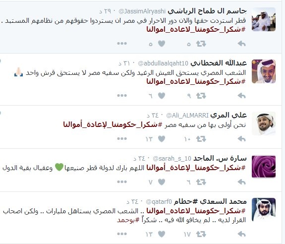احتفى الرأى العام القطري بسداد البنك المركزي المصري مليار دولار مقابل سندات كانت طرحتها مصر في عهد الرئيس محمد مرسى وقام بتغطيتها بنك قطر الوطني،على موقع التواصل الإجتماعي "تويتر".