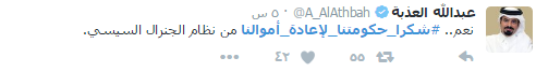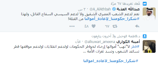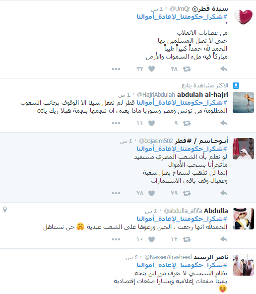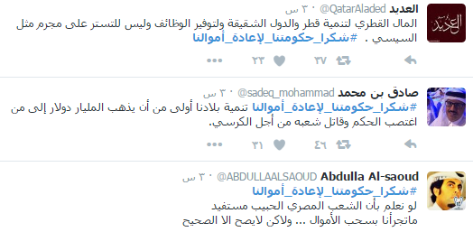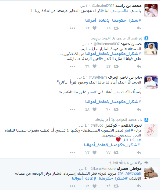 مغردون بموقع التواصل الإجتماعي “تويتر”أطلقوا هاشتاج بإسم “شكرا_حكومتنا_لإعادة_أموالنا” مساء أمس الجمعة وذلك لتوجيه الشكر الي الحكومة نظرا لاستعادة أموال الودائع التي كانت لدى نظام عبدالفتاح السيسي.