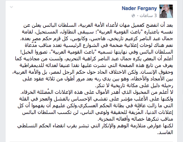 وسخر من مقارنة عبدالفتاح السيسي نفسه بالرئيس الراحل جمال عبدالناصر، قائلا: “أعلم أن البعض يكره جمال عبد الناصر كراهية التحريم، ولست من مجاذيبه كما يعرف من تابع هذه الصفحة التي نشرت عليها نقدا عنيفا لعدائه للديمقراطية وحقوق الإنسان، ولكن الاختلاف الحاد حول حكم الرجل لمصر، بل والأمة العربية، بين الأمجاد والأخطاء، وهو بين يدي ربه بعد مرور أطول من ثلاثة عقود على رحيله دليل على مكانة تاريخية لا تنكر”.