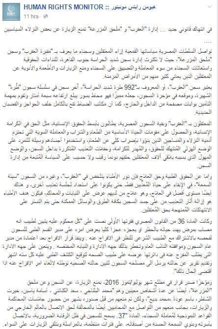 وأشارت “مونيتور” إلى أن هذا الإجراء مخالف لحق الاتصال بالعالم الخارجي من القواعد النموذجية الدنيا لمعاملة السجناء، حيث تنص المادة 37 على ضرورة السماح للسجين في ظل الرقابة الضرورية، بالاتصال بأسرته وبذوي السمعة الحسنة من أصدقائه، على فترات منتظمة، بالمراسلة وبتلقي الزيارات على السواء.