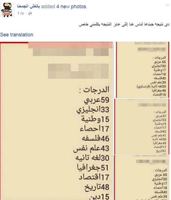 نشرت صفحة “بالغش اتجمعنا” إحدى صفحات الغش على موقع التواصل الاجتماعى “فيس بوك” صورة من نتائج بعض طلاب الثانوية العامة، وعلق أدمن الصفحة : “دى نتيجة جبناها لناس هنا واللى عايزها يكلمنى”.
