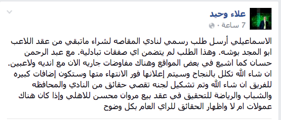 ونشر وحيد عبر حسابه الرسمي على موقع فيسبوك للتواصل الإجتماعي، ما يفيد بنية الإسماعيلي التعاقد مع عدداً من اللاعبين خلال فترة الانتقالات الحالية، لتدعيم صفوف الفريق قبل بداية الموسم الجديد.