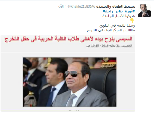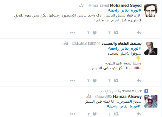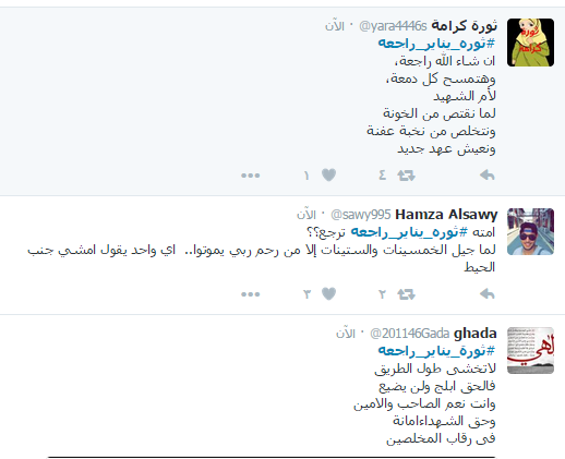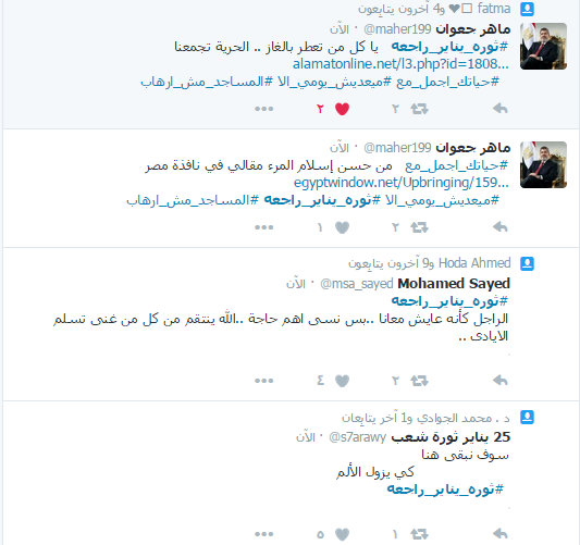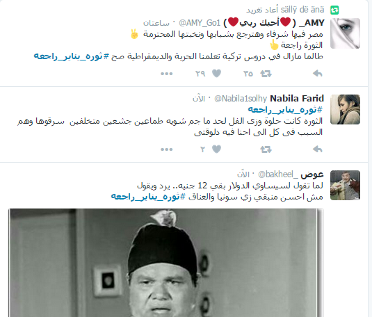 دشن رواد موقع التواصل الاجتماعي “تويتر” هاشتاج ” ثورة يناير راجعة” بالتزامن مع خروج الآلاف في الشوارع استجابة لدعوة التحالف الوطني لدعم الشرعية للانطلاق في مسيرات ضد النظام العسكري.
