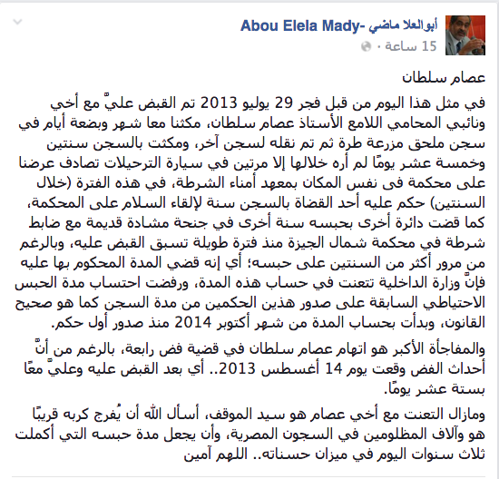 وأضاف ماضي خلال منشور له على صفحته الشخصية بموقع التواصل الاجتماعي “فيس بوك” :” في هذه الفترة (خلال السنتين) حكم عليه أحد القضاة بالسجن سنة لإلقاء السلام على المحكمة، كما قضت دائرة أخرى بحبسه سنة أخرى في جنحة مشادة قديمة مع ضابط شرطة في محكمة شمال الجيزة منذ فترة طويلة تسبق القبض عليه”.