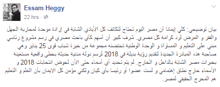 واختتم منشوره قائلًا: لم يتم تحديد أي أسماء حتى الآن لخوض انتخابات 2018م، والأسماء خارج نطاق اهتمامي ولست عضوًا أو رئيسًا بأي كيان، ولكنني مؤمن كل الايمان بأن العلم والتعليم هما المخرج الحقيقي لمصر”.