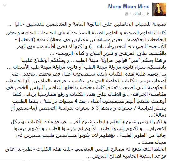 وقالت مينا، في تدوينة لها عبر موقع التواصل الاجتماعي “فيس بوك”، “نصيحة للشباب الحاصلين على الثانوية العامة والمتقدمين للتنسيق حاليًا، كليات العلوم الصحية والعلوم الطبية المستحدثة في الجامعات الخاصة وبعض الجامعات الحكومية  تخرج مساعدين ممتازين في مجالات عدة (التحاليل- الأشعة- البصريات- التخدير- أسنان …الخ)، ولكنها لا تخرج أطباء مسموحًا لهم بالكشف على المرضى وتقرير العلاج وكتابة الروشتة وهذا بحكم نص قوانين مزاولة مهنة الطب، ويمكنكم الاطلاع عليها بأنفسكم سواء قانون مزاولة مهنة الطب أو قانون مزاولة مهنة طب الأسنان.