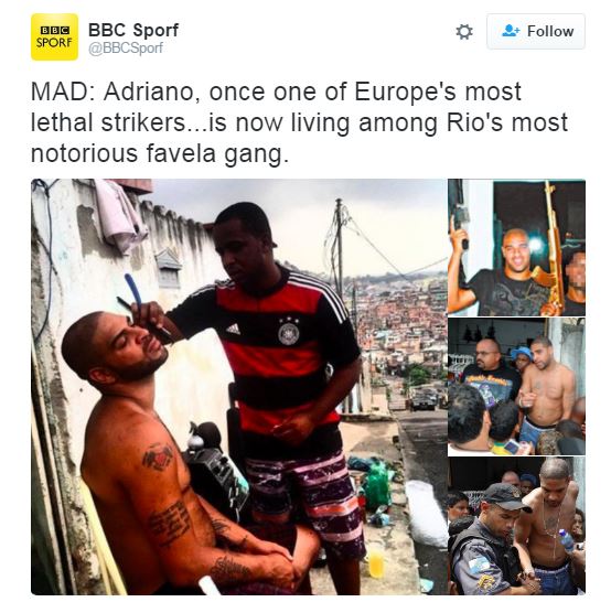 انقلب حال اللاعب البرازيلي أدريانو رأسًا على عقب خلال فترة زمنية وجيزة، فبعد أن كان اللاعب في المصاف الأولى للاعبين الرياضيين لكرة القدم، أصبح له سجل إجرامي، بوصفه أحد أفراد العصابات الخطيرة في ريو دي جانيرو.