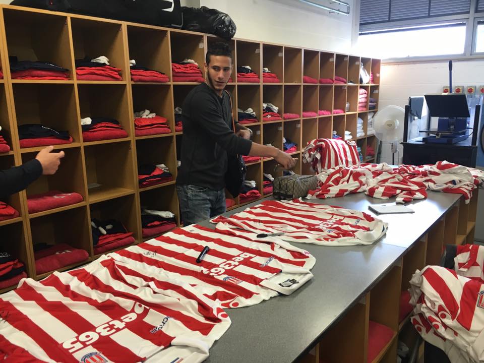 ونشر الحساب الرسمي لنادي ستوك سيتي عدة صور لرمضان صبحي أثناء توقيعه على قمصان الفريق.
