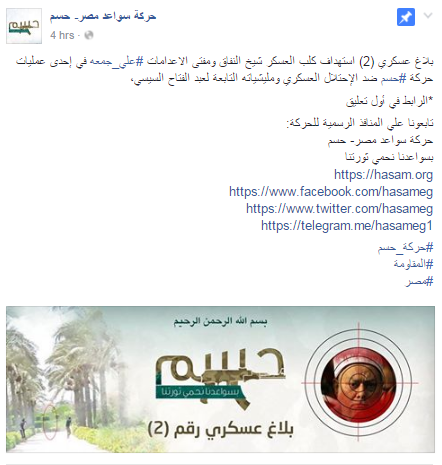 وقالت الحركة في بيان لها على موقع التواصل الاجتماعي “فيسبوك” تحت عنوان “بلاغ عسكري (2)”: استهداف …. شيخ النفاق ومفتى الاعدامات علي جمعه في إحدى عمليات حركة حسم ضد اﻹحتلال العسكري ومليشياته التابعة لعبد الفتاح السيسي.