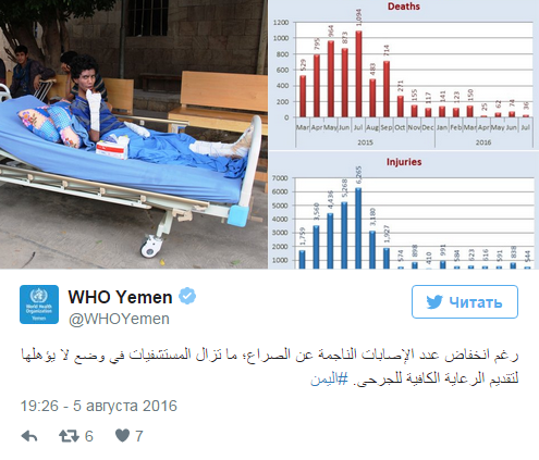 أعلنت منظمة الصحة العالمية، عن مقتل 6 آلاف و600 شخص، في اليمن، منذ مارس 2015، حتى أواخر يوليو الماضي ، فيما تم تسجيل 32 ألف و964 جريحا خلال نفس الفترة.