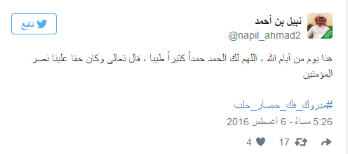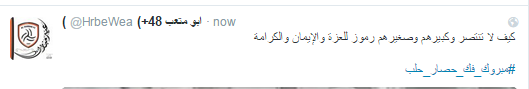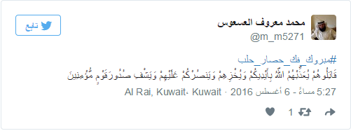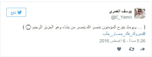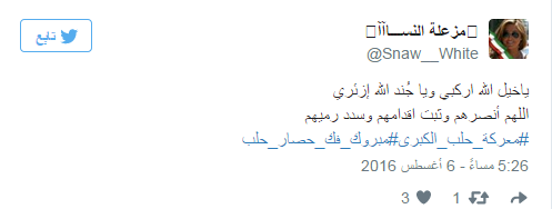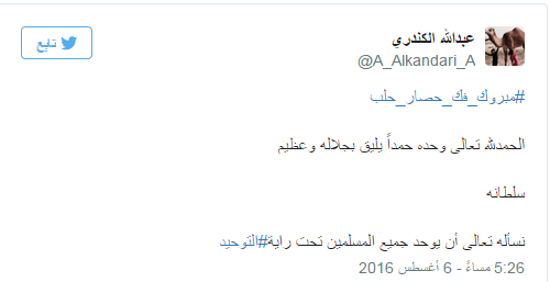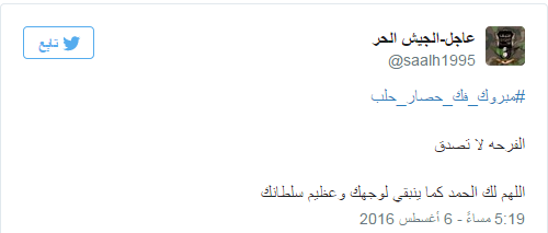 دشن مغردو موقع التدوين العالمي “تويتر” هاشتاجًا حمل عنوان “#مبروك_فك_حصار_حلب”، احتفوا من خلاله بنجاح فصائل المعارضة السورية في تحرير مدينة حلب بالكامل، اليوم السبت، من أيدي ميليشيات النظام بعد معارك طاحنة استمرت لأيام.