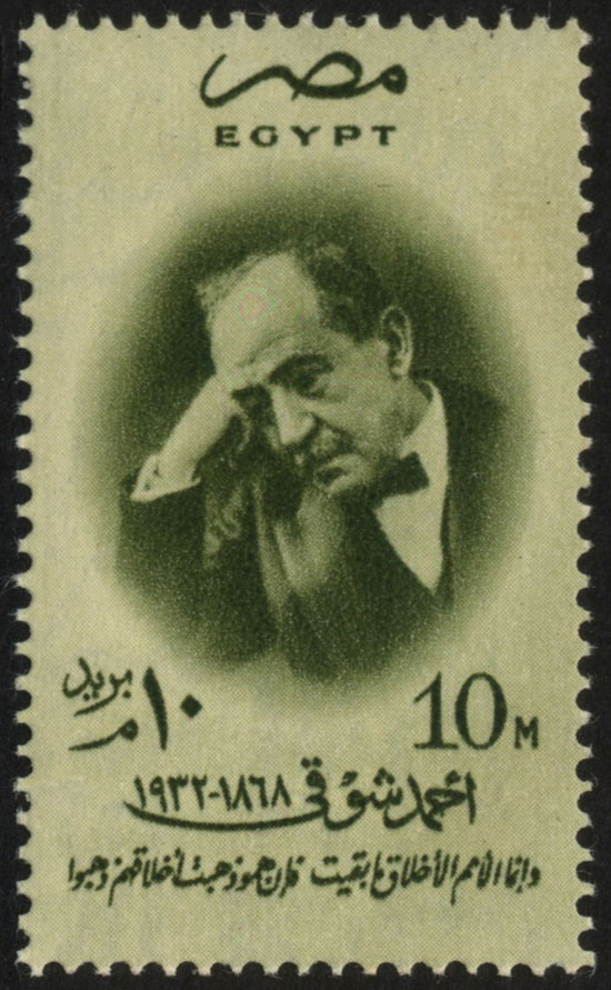 الشاعر أحمد شوقى، صدرله طابع تذكاري بمناسبة مرور 25 عاما على وفاته، ومكتوب عليه “إنما الأمم الأخلاق ما بقيت فإن همو ذهبت أخلاقهم ذهبوا”، بقيمة 10 مليم.
