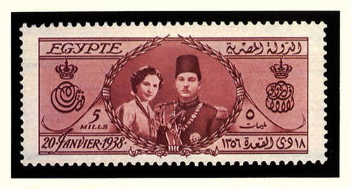 صدرت قبل ثورة يوليو عدة طوابع في مناسبات مختلفة للملك فاروق، منها هذا الطابع الصادر عام 1938 عليه صورة الملك وزوجته الملكة فريدة.