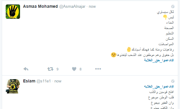 دشن مغردو موقع التدوين العالمي”تويتر” هاشتاج “ادعموا حق الغلابة” ضد رسائل السيسي العشرة التي دعا خلالها الى الترشيد والتقشف، في ظل زيادة معدل البطالة والفقر، بالاضافة الى ارتفاع معدل التضخم وانخفاض قيمة الجنيه المصري مقابل الدولار الأمريكي والذي اقترب من الوصول إلى 13 جنيه.