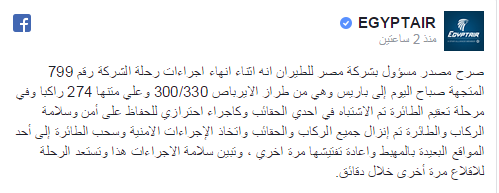 وأكدت شركة “مصر للطيران” على حسابها على موقع التواصل الاجتماعي “فيسبوك” إتمام الإجراءات على الطائرة، وتأكد سلامتها .