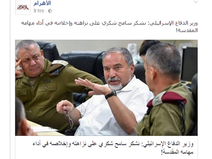 قامت صحيفة الأهرام، مساء أمس الاثنين، بحذف خبرًا نشرته عبر موقعها الإلكتروني تحت عنوان: “وزير الدفاع الإسرائيلي: نشكر سامح شكري على نزاهته وإخلاصه في أداء مهامه المقدسة!”.