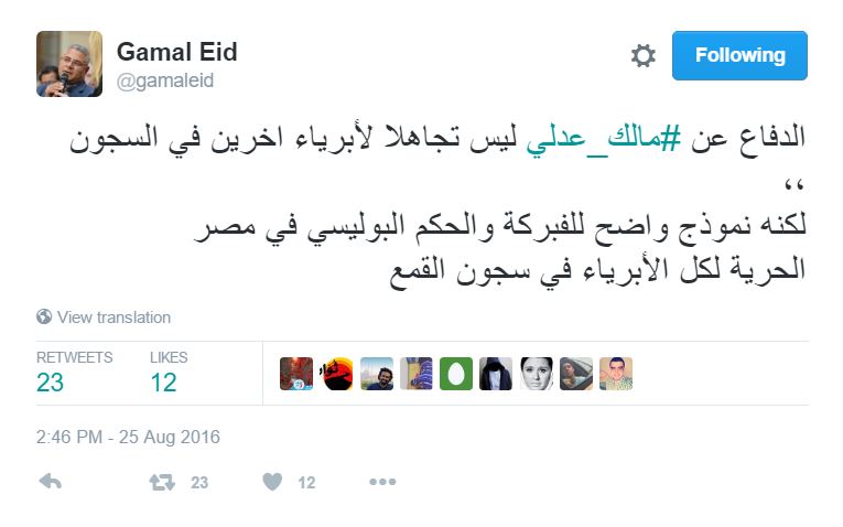 وعلق الحقوقي جمال عيد عن الدفاع عن الناشط مالك عدلي، وقال في تغريدة له : الدفاع عن مالك عدلي ليس تجاهلاً لأبرياء آخرين في السجون، ولكنه نموذج واضح للفبركة، والحكم البوليسي في مصر”.