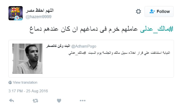 أطلق نشطاء مواقع التواصل الاجتماعي، هاشتاجًا باسم “مالك_عدلي” بعد قرار إخلاء سبيله بضمان مقر إقامته، على خلفية اتهامه بالتحريض على التظاهر وقلب نظام الحكم.