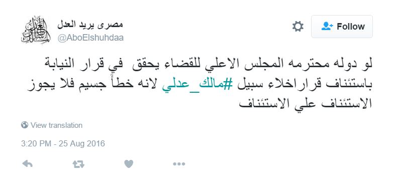 وتصدر الهاشتاج موقع التواصل الاجتماعي “تويتر” بعد أن أصدر قاضي المعارضات بمحكمة جنايات شبرا الخيمة، اليوم الخميس، إخلاء سبيل الناشط الحقوقي والمحامي مالك عدلي بضمان محل إقامته، بعد اتهامه بنشر أخبار كاذبة عن جزيرتي “تيران وصنافير”.
