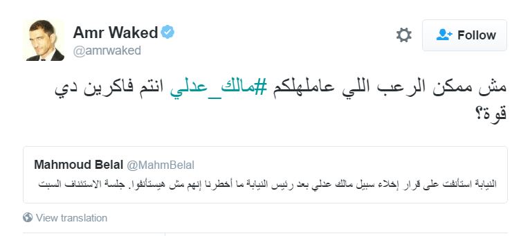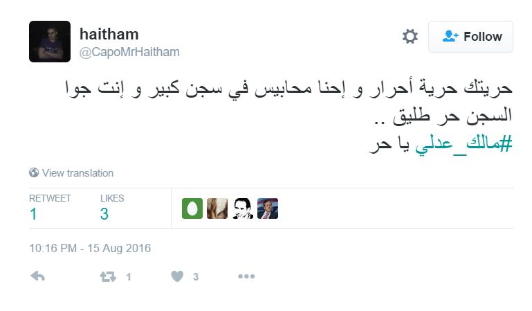 وتداول مغردون على موقع التدوينات الصغير خبر إخلاء سبيل الناشط السياسي مالك عدلي، بالتهنئة، وأعربوا عن تمنيهم خروج كافة المعتقلين سياسيًا.