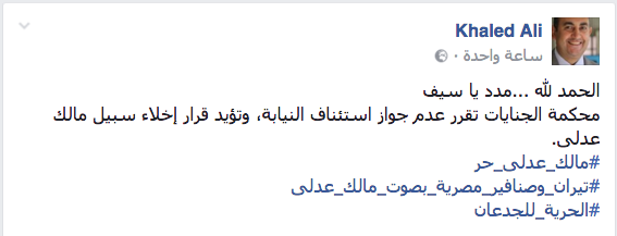 قال خالد على عبر حسابه على موقع التواصل الاجتماعى “فيس بوك” : “الحمد لله …مدد يا سيف، محكمة الجنايات تقرر عدم جواز استئناف النيابة، وتؤيد قرار إخلاء سبيل مالك عدلى”.