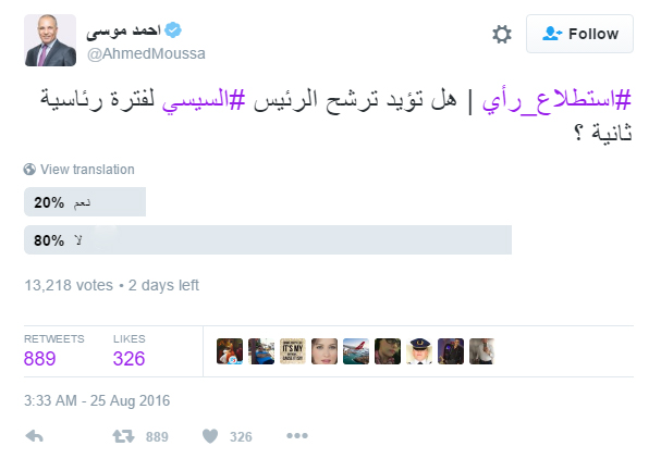 وكان أحمد موسى، قد أجرى استطلاعًا للرأي، أول أمس، على حسابه الرسمي عبر موقع التواصل الإجتماعي “تويتر”، لسؤال الجمهور عن تأييدهم لترشح عبدالفتاح السيسي لفترة رئاسية ثانية.