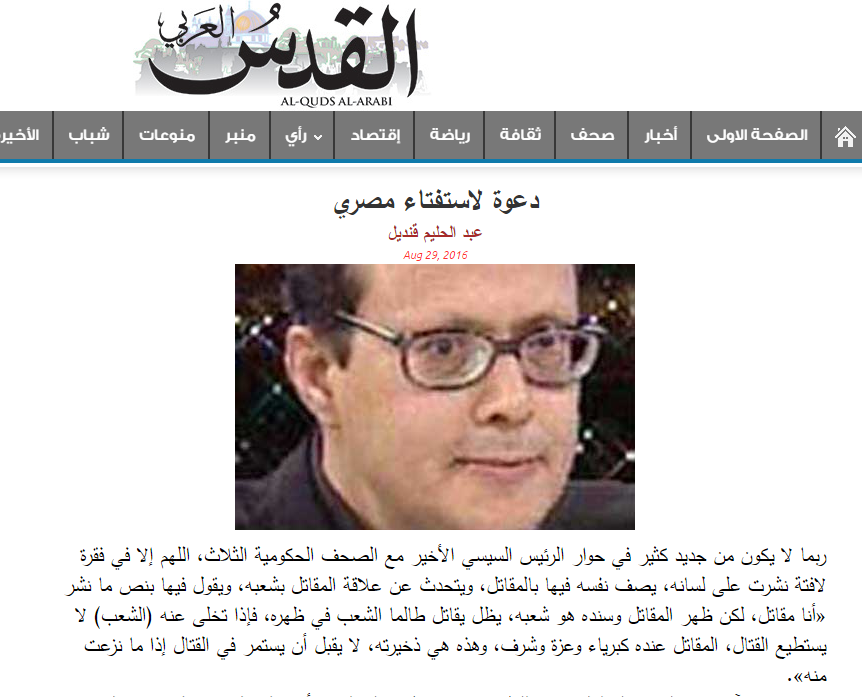 وفي مقال له على موقع “القدس العربي” دعا إلى استفتاء الشعب مباشرة في برنامج “الإصلاح” مضيفًا: الرضــا أو الغضب لا يظهر بغير البث المباشر لصوت الشعب.