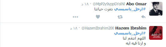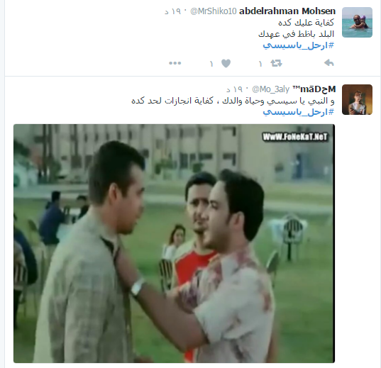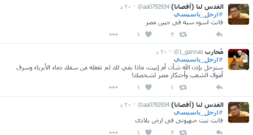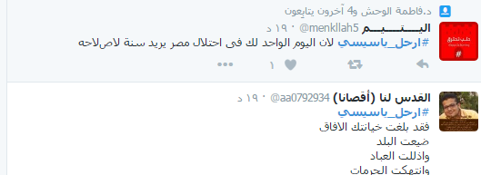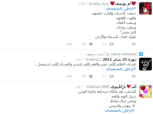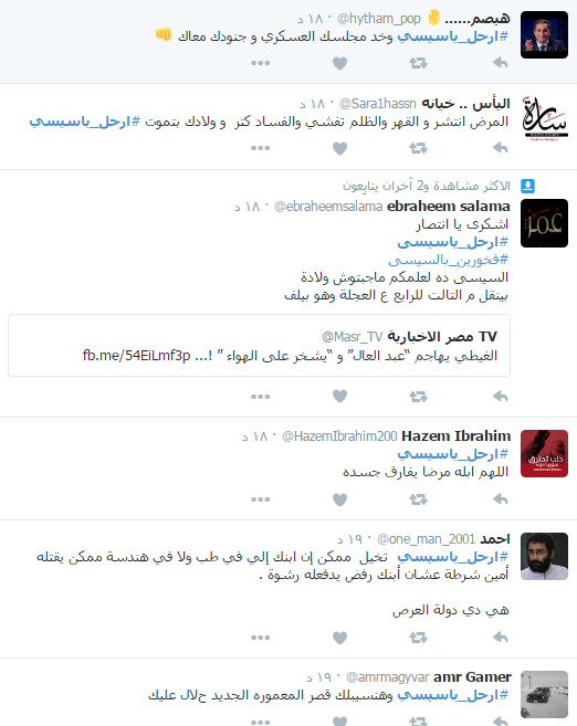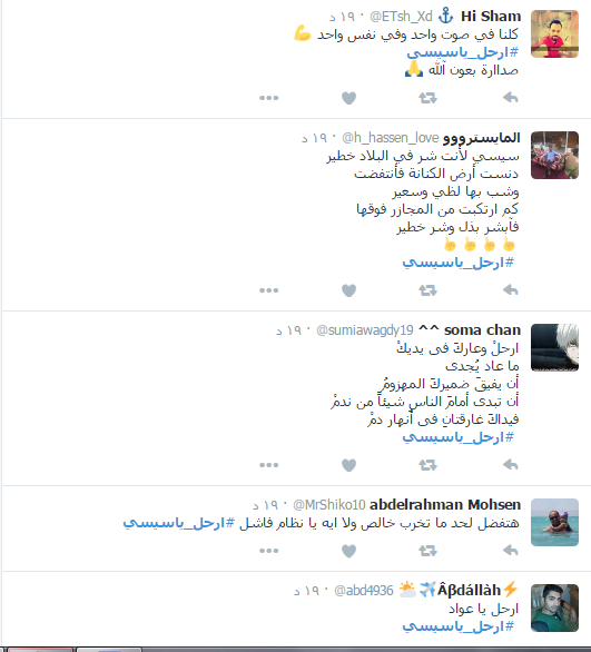 وأجمع النشطاء خلال الهاشتاج بضرورة رحيل السيسي معددين الأسباب منها “تفشي الظلم والفساد-  قهر الشباب والزج بهم في السجون – التعاون من الكهيان الصهيوني – انهيار الوضع الاقتصادي “.