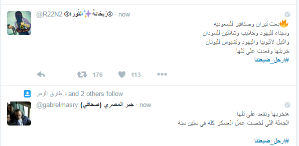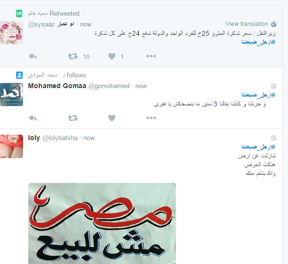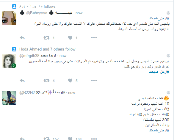 دشن مغردو موقع التدوين العالمي “تويتر” هاشتاج “ارحل ضيعتنا”، في إشارة منهم إلى عبدالفتاح السيسي، مطالبين إياه بالتنحي عن حكم البلاد فورًا.