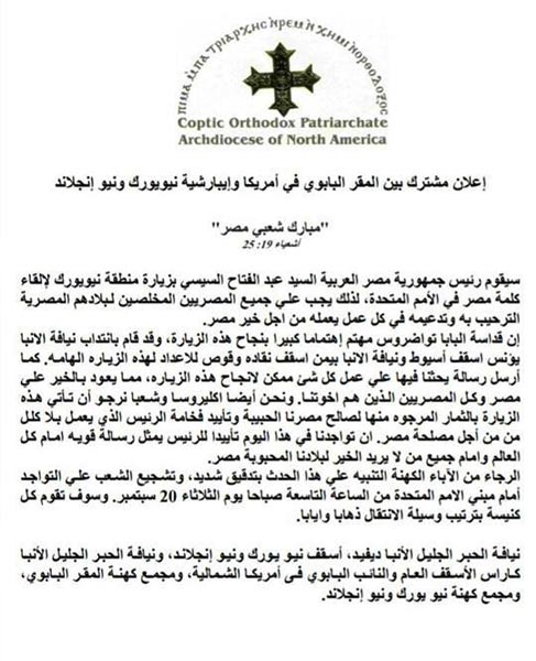 أصدرت الكنيسة إعلانًا مشتركًا بين المقر البابوي في أميركا وإبراشية نيويورك ونيو إنجلاند دعت فيه رجال الكنيسة إلى حشد من يستطيعون من الأقباط ليكونوا في استقبال عبد الفتاح السيسي خلال زيارته للولايات المتحدة الأميركية.