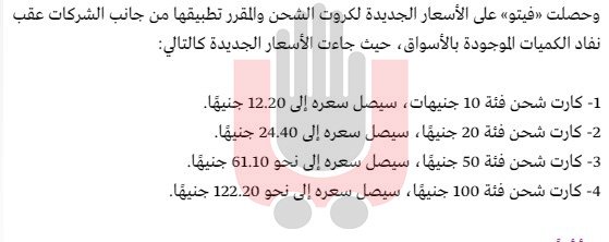 وبحسب الأسعار التي نشرها موقع “فيتو” فإن الزيادة الجديدة لكروت الشحن والمقرر تطبيقها من جانب الشركات عقب نفاد الكميات الموجودة بالأسواق، كالتالي: