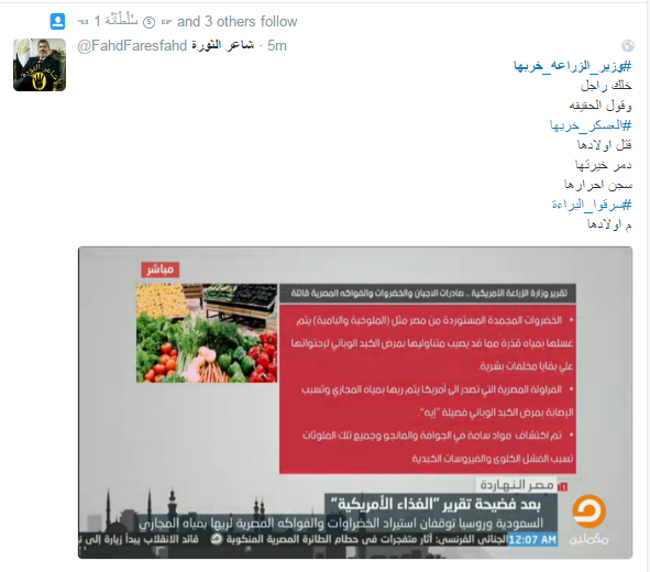 دشن مغردو موقع التدوين العالمي “تويتر” هاشتاج “وزير الزراعة خربها”، بسبب حدوث أزمات جديدة بالوزارة تحت قيادة الدكتور عصام فايد، هذه الفترة، والتي كان آخرها شحنة القمح الفاسدة.