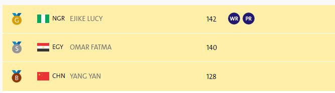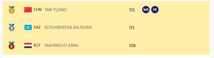 وفازت الرباعة المصرية رحاب أحمد بالميدالية الفضية، في منافسات رفع الأثقال وزن 50 كجم نساء، وجاءت رحاب بالمركز الثاني بعد رفعها لوزن قدره 104 كجم.