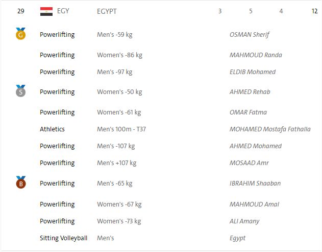 وانتهت اليوم بطولة الألعاب البارالمبية والتي بدأت في 8 سبتمبر الجاري، واحتلت مصر الترتيب الـ 29 في الدورة.