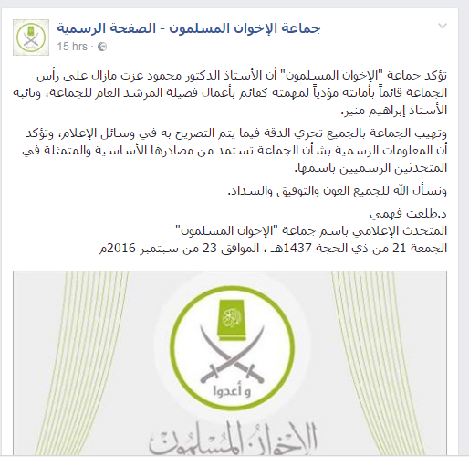 لكن جماعة “الإخوان المسلمون” أعلنت أن الدكتور محمود عزت مازال على رأس الجماعة قائماً بأمانته مؤدياً لمهمته كقائم بأعمال المرشد العام للجماعة، ونائبه إبراهيم منير.