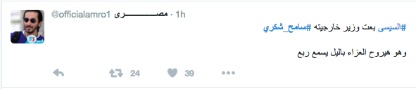 – جاءت بعض تعليقات رواد موقع التواصل الاجتماعي “تويتر” على هاشتاجي “سامح شكري” ، و”التعزيه في بيريز خيانة” ، كالتالي :
